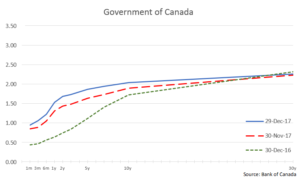 Bank of Canada Governor Stephen Poloz raised the benchmark interest rate by 25 basis points twice in 2017, doubling Canada’s policy rate from 0.50 per cent to 1.00 per cent. Poloz cited Canada’s stronger-than-expected economic performance in the year as reason for these hikes. The domestic yield curve (see Government of Canada chart) shifted upwards again this year with the 2-year and 10-year Government of Canada benchmark bonds closing 1.69 per cent and 2.04 per cent, respectively.