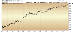 Despite uncertainties, international markets saw a stark improvement from 2016 levels. On a similar, uninterrupted trajectory as SPX, the MSCI EAFE Index ($MSEAFE) gained 17.2 per cent (C$) in 2017, including dividends. The Eurozone, Japan, and emerging economies all benefited from record trade flows. Government spending is also on the rise in China. The country continues to rollout its 5-year plan with social services, pensions, and healthcare coverage expected to see a boost.