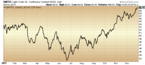 Oil had a dynamic year. In the first half, the West Texas Intermediate ($WTIC) light crude oil price fell from the US$53 per barrel level—achieved in 2016’s 45 per cent rally—settling at below US$43 per barrel in June. In the second half, a strong rebound, with inventories falling and OPEC extending its production cuts in November. WTI finished the year at US$60 per barrel, on the higher end of forecasts. While optimistic, analysts are cautious to label this level the new norm—short-term influences, such as Venezuela’s production issues and Iran’s protests, may have contributed to this recovery.