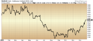 Prior to the final quarter, gold prices were trending downwards, falling from US$1,303.46 at the start of the year to just above US$1,180.00 in August. However, the precious metal’s reputation as a “safe haven” investment seems to have helped prices recover. While the commodity is still down 1.7 per cent year-to-date, gold ended the year at US$1,281.34 and is trending back towards the US$1,300 price level.
