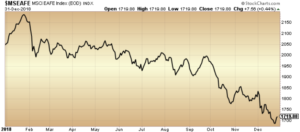 The MSCI EAFE Index ($MSEAFE) fell 13.4 per cent on a total return basis for 2018, reflecting protests in France, Brexit uncertainty, tighter financial conditions and trade tensions across the Euro zone. Meanwhile, Chinese markets, proxied by the Shanghai Composite, fell 24.6 per cent in 2018 as trade uncertainty plagued investor confidence, though talks with America and the current tariff truce may improve sentiment for the region.