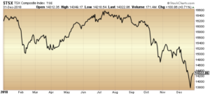 Canadian markets have been abnormally volatile this year, falling steeply in January and again in the final quarter of 2018. As a result, the S&P/TSX Composite Index ($TSX) ended the year down 11.6 per cent. Even after we take dividends into account, the index’s total return was a negative 8.9 per cent. Financials and Energy, which alone make up roughly half of the entire S&P/TSX Composite index, were down 9.3 and 18.3 per cent respectively. In fact, only three of Canada’s eleven sectors (Consumer Staples, Information Technology and Real Estate) achieved a positive total return in 2018.