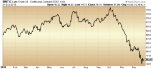 Oil experienced a drastic inflection this year. At first, a rally; Q1 to Q3 of 2018 saw the West Taxes Intermediate ($WTIC) climb 21.1 per cent from US$60.42 to US$73.25, with some speculating that prices would finally return to US$100.00 a barrel. However, hopes of a sustained price recovery were quickly slashed in the last quarter of the year, as record output from Saudi Arabia/U.S. and rising production from Iraq dropped prices to US$45.41 a barrel.